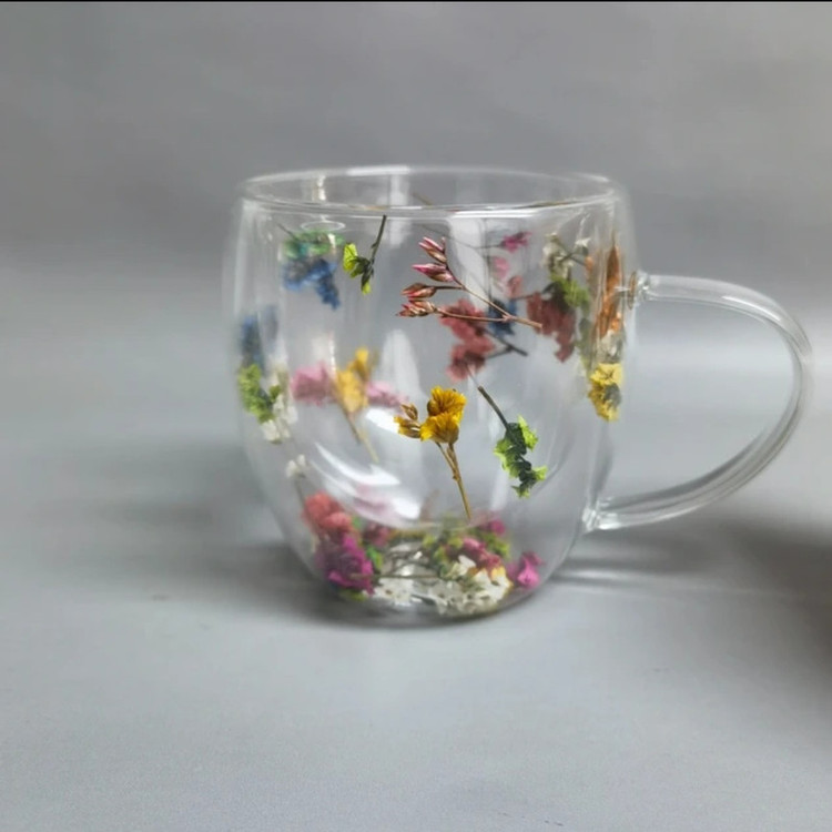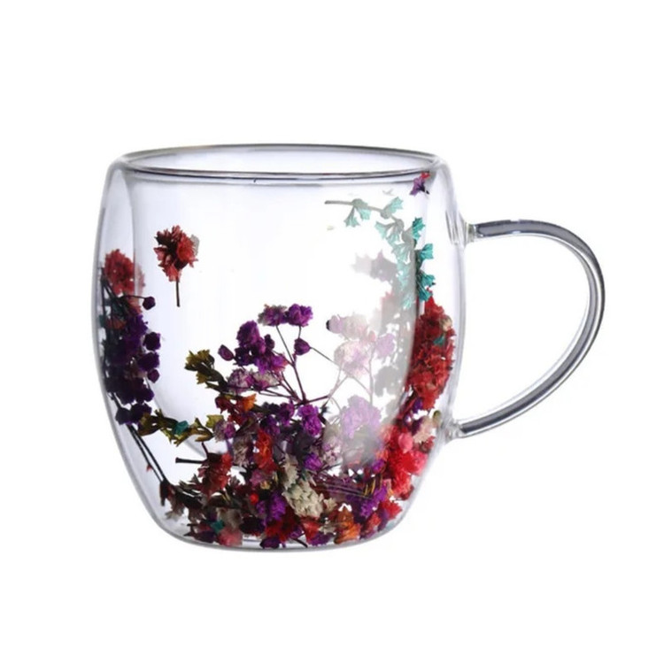 لیوان دو جداره گلدار در بین جداره های آن از گلهای زیبای طبیعی استفاده شده است که در هنگام مشاهده حس زیبای طبیعت را به شما القا میکند حجم آن 300 میلی لیتر میباشد که یکی از مزیت های آن به علت دوجداره بودن محصول مایع داخل آن دیرتر دمای خود را از دست میدهد.