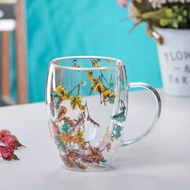 گنجایش 350 میلی لیتر .بین دو جدار لیوان گل خشک قرار گرفته است.