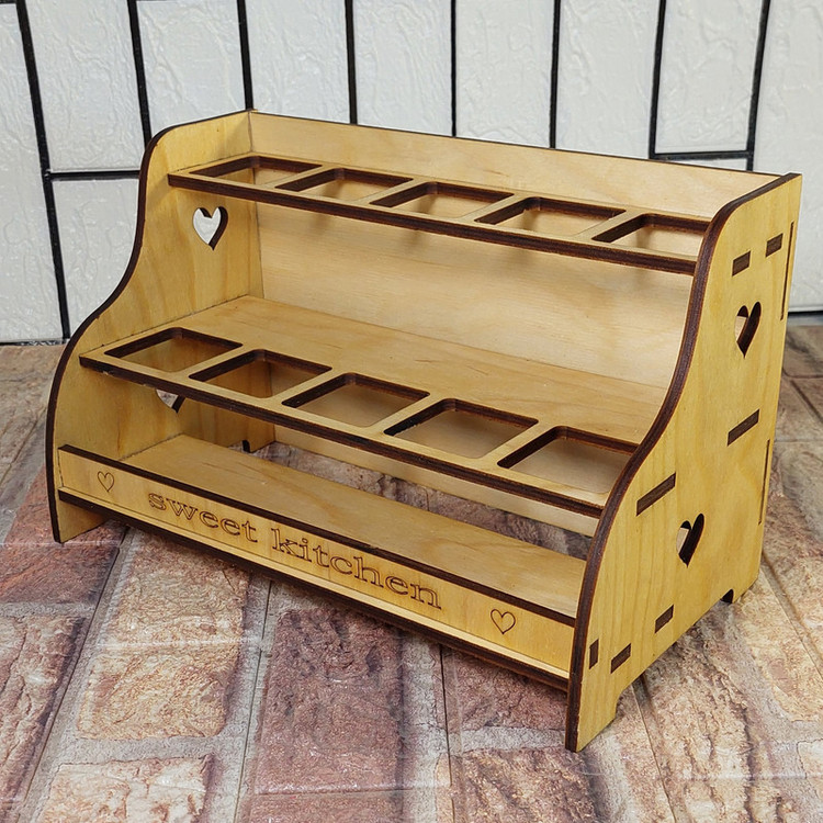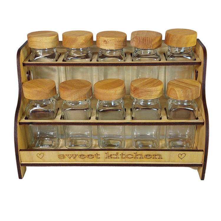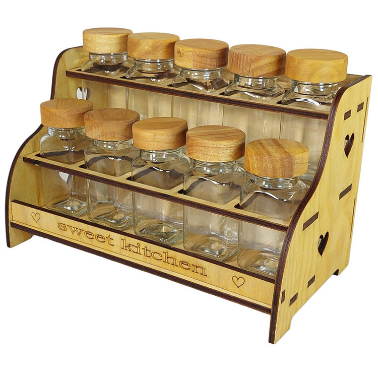ابعاد ظروف شیشه ای ۱۰×۵×۵ ابعاد استند به طول ۳۰ عرض ۱۶ ارتفاع ۱۸ جنس استند چوب جنس درب ادویه چوب رابر همه ی ادویه ها دارای درپوش سیلیکونی نمکپاشی هستند