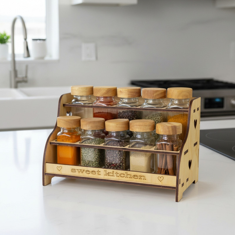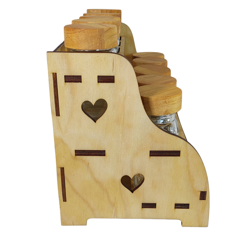 ابعاد ظروف شیشه ای ۱۰×۵×۵ ابعاد استند به طول ۳۰ عرض ۱۶ ارتفاع ۱۸ جنس استند چوب جنس درب ادویه چوب رابر همه ی ادویه ها دارای درپوش سیلیکونی نمکپاشی هستند