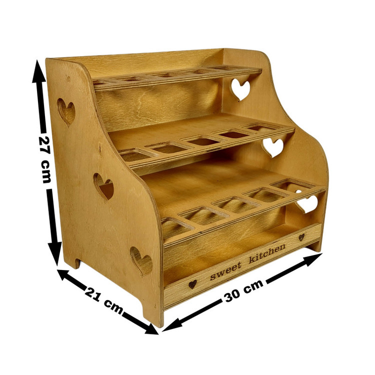 ابعاد ظروف ادویه شیشه ای طول و عرض ۵ و ارتفاع ۱۳ سانتی میباشد ابعاد استند چوبی نیز طول ۳۰ عرض ۲۱ ارتفاع ۲۷ سانتی متر میباشد تعداد ۱۵ جای ادویه به همراه یک استند ارسال میشود ادویه ها همگی دارای درپوش سیلیکونی نمکپاشی میباشند