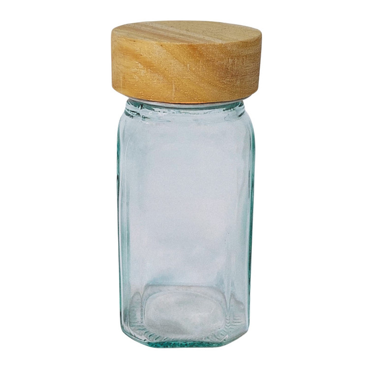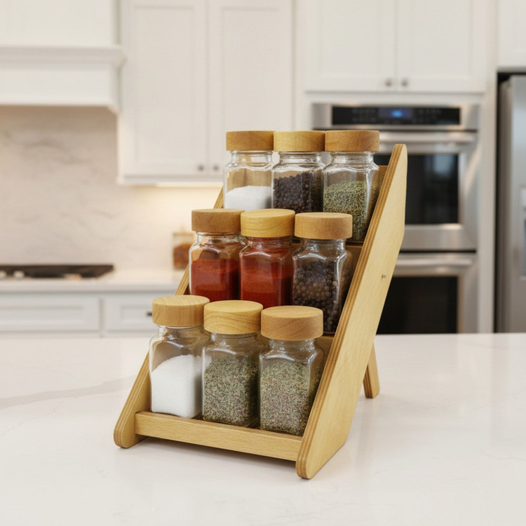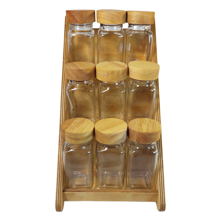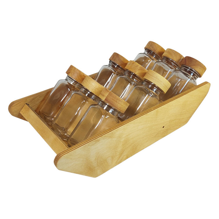 تعداد ۹ عدد ظرف ادویه شیشه ای (ارتفاع ۱۰) دارای درب چوبی به همراه درپوش نمکپاش سیلیکونی در کنار یک استند چوبی دو حالته که با پایه ی پیچ شو میتواند از حالت خوابیده و توکشویی به حالت ایستاده و رومیزی درآید، ارائه میشود. پایه ی استند ثابت است و تاشو نیست.