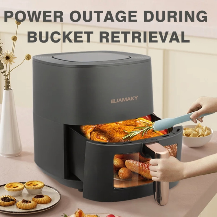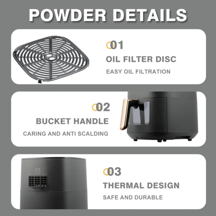این دستگاه بسیار شیک در دو رنگ سفید و مشکی مات رنگ، بسیار کم صداست. دارای قفل کودک بوده و امکان خاموش کردن خودکار را دارد. دمای دستگاه را میتوان بین 80 تا 200 درجه سانتیگراد تنظیم کرد. این دستگاه از قابلیتهای یخزدایی، گرم نگه داشتن غذا، گریل کردن و سرخ کردن برخوردار است. دارای سبد نچسب و ضدخش بوده و میتوان قطعات آن را در ماشین ظرفشویی شست. گنجایش روغن آن 7 میلیلیتر (برای سرخ کردن بدون روغن) است. از قابلیت پخت به وسیله چرخش هوای گرم برخوردار بوده و دارای8 برنامه پخت از پیش تعیین شده است. دارای برنامه یخزدایی و گرمکردن غذا بوده و مجهز به تکنولوژی Rapid Air (جلوگیریکننده از بو هنگام سرخ کردن و گردش سریع هوا) و فناوری پخش سریع و یکنواخت حرارت در محفظه غذا است. این دستگاه از قابلیت ذخیره دستور پخت شخصی به منظور اجرای مجدد و مکرر برخوردار است. این دستگاه به شما امکان کاهش مصرف روغن، تنظیم دما و زمان متناسب با غذای در حال پخت، طی شدن سریع فرایند پخت، پخت یکنواخت غذا، پخت سالم و حفظ مواد مغذی غذا را میدهد